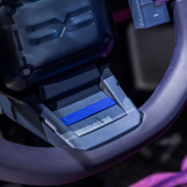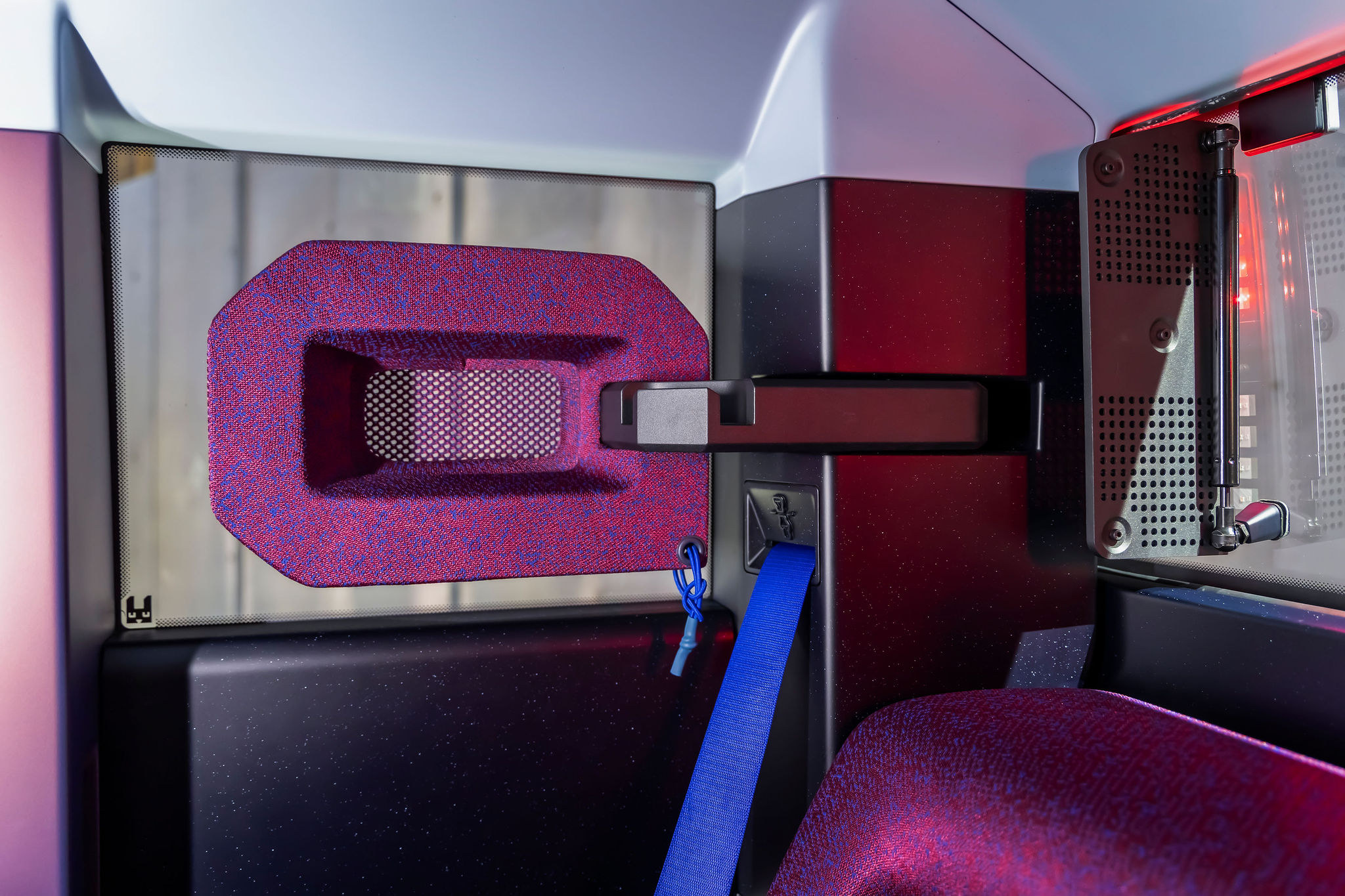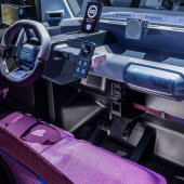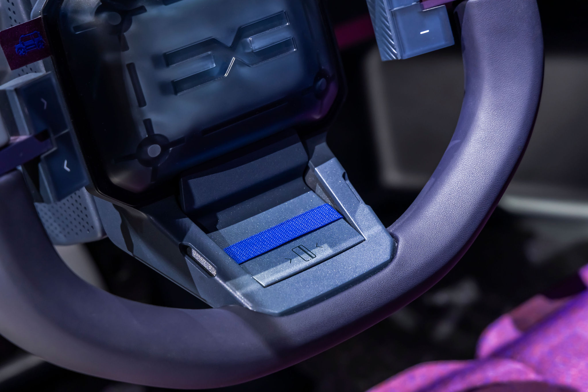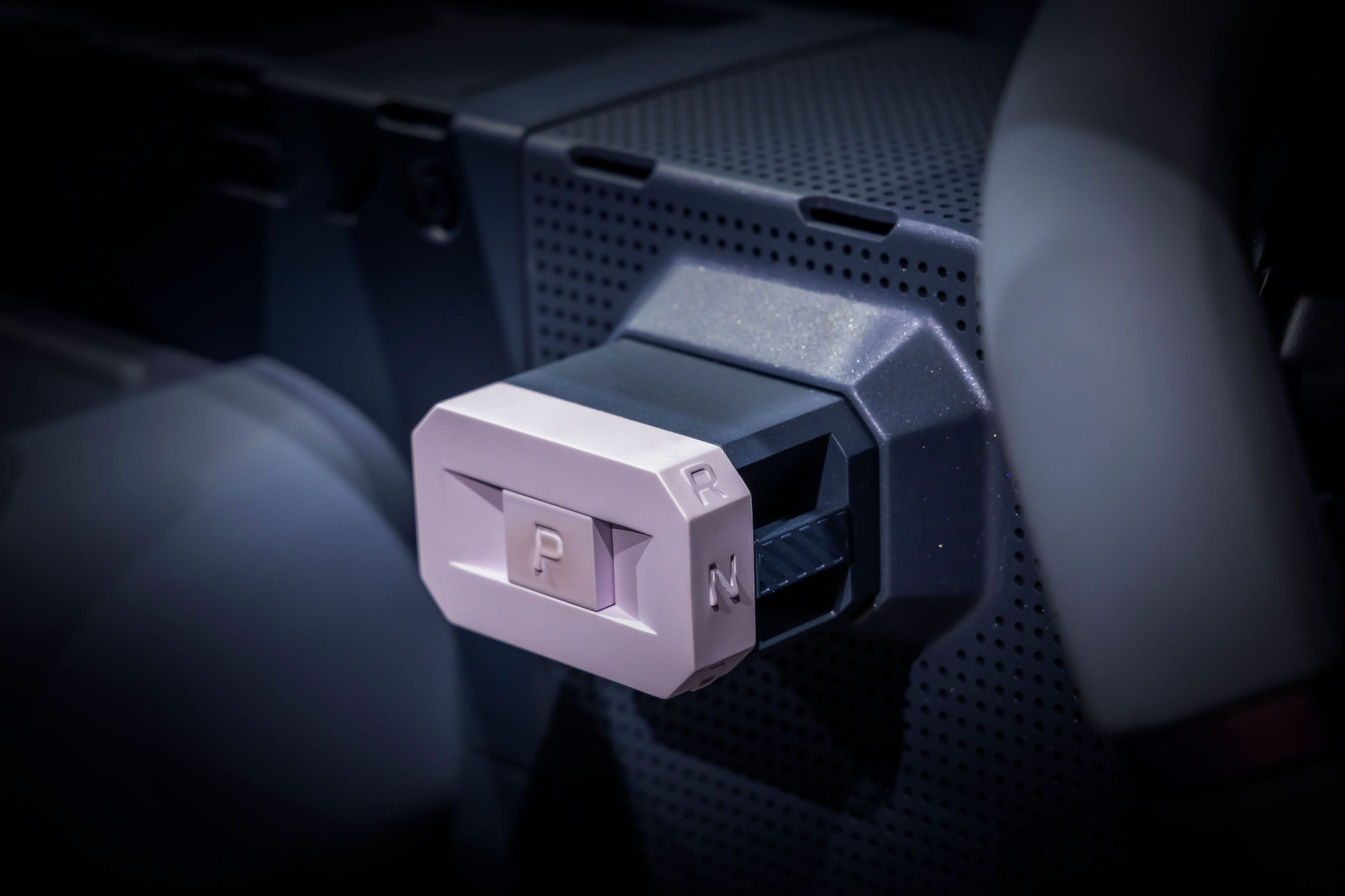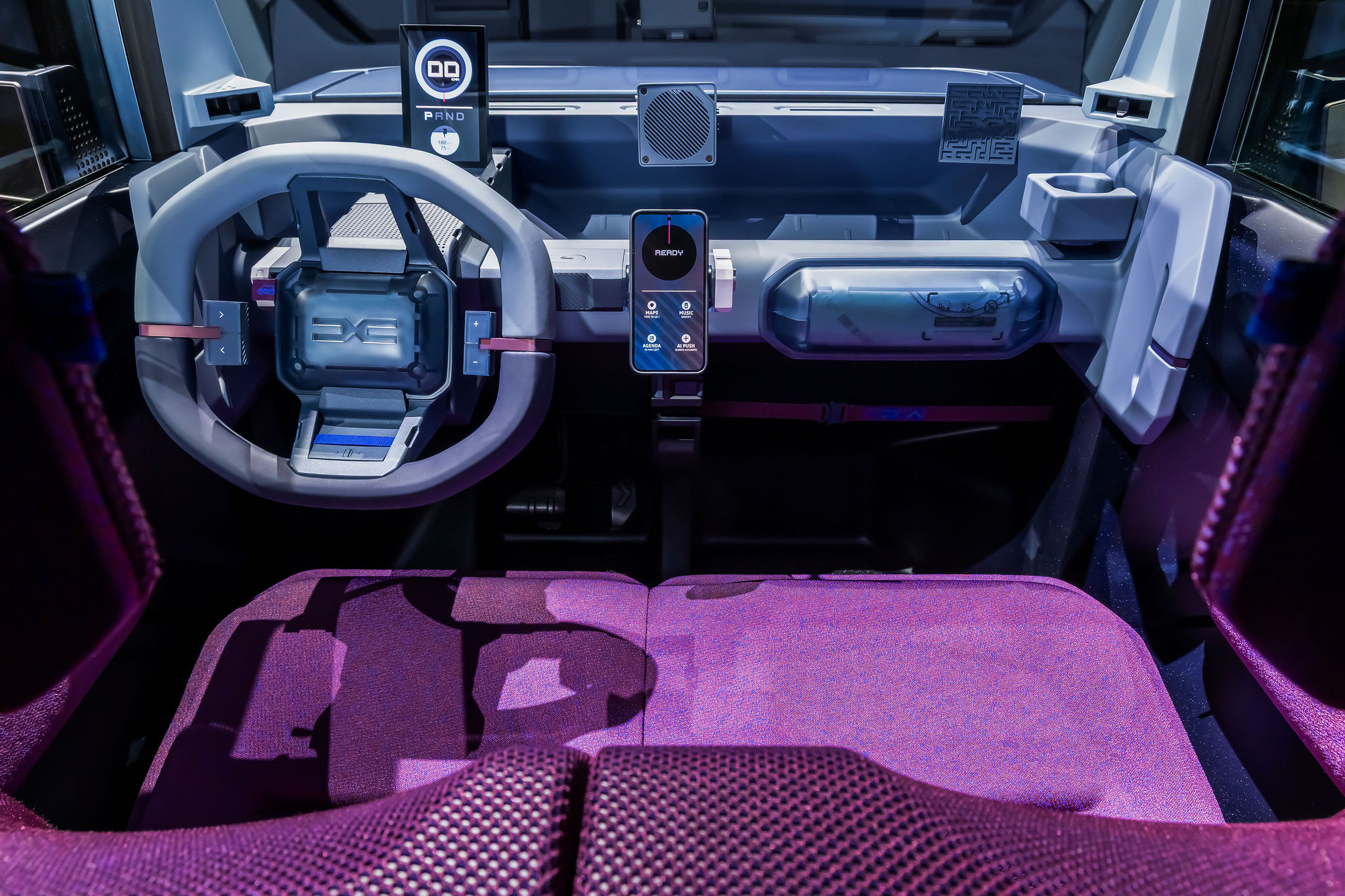 À l’intérieur, l’habitacle est fidèle à l’extérieur, avec quelques astuces pour agrandir cet espace. Une vitre placée juste au-dessus du pare-brise apporte un surplus de lumière qui évite de se sentir comme dans une boîte à sardines. Les vitres peuvent bien sûr s’ouvrir, mais plutôt que d’utiliser un mécanisme lourd et coûteux, il suffit, à la manière de l’ancienne R4, de les faire coulisser. Face au conducteur, l’interface est minimaliste : un petit écran numérique de la taille d’un téléphone affiche les informations essentielles (vitesse, rapport engagé, charge).