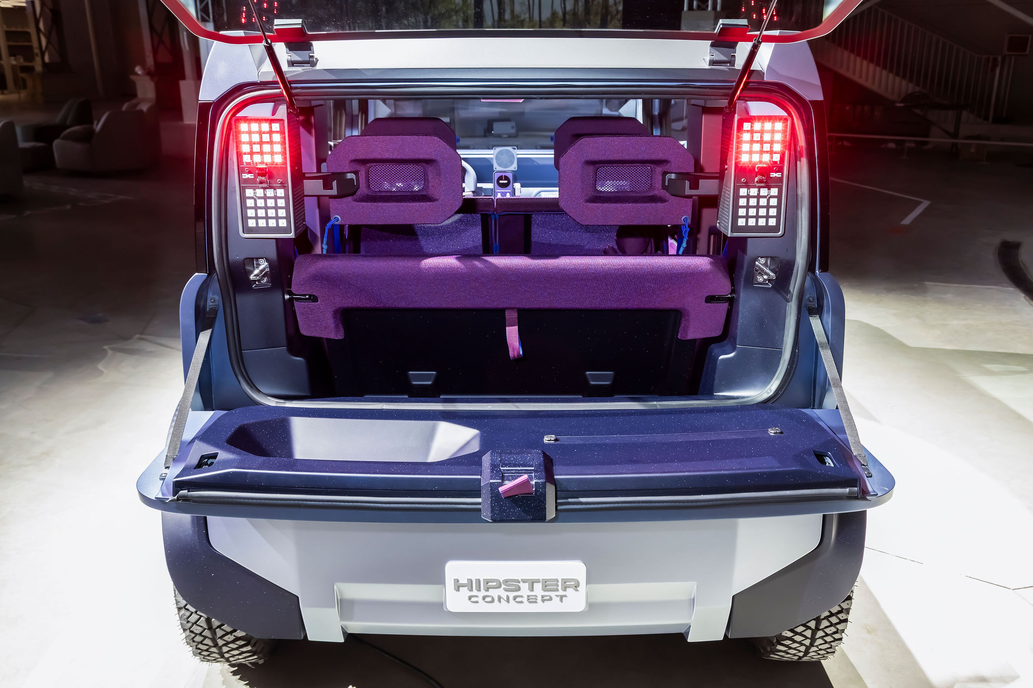 Le Hipster a été conçu pour réduire les coûts, mais aussi le poids au maximum, en optant pour des solutions simples. Cela se remarque à de nombreux détails. Par exemple, les feux arrière ne sont protégés que par la vitre de coffre (qui court sur toute la largeur), et le dossier des sièges avant est dépouillé.